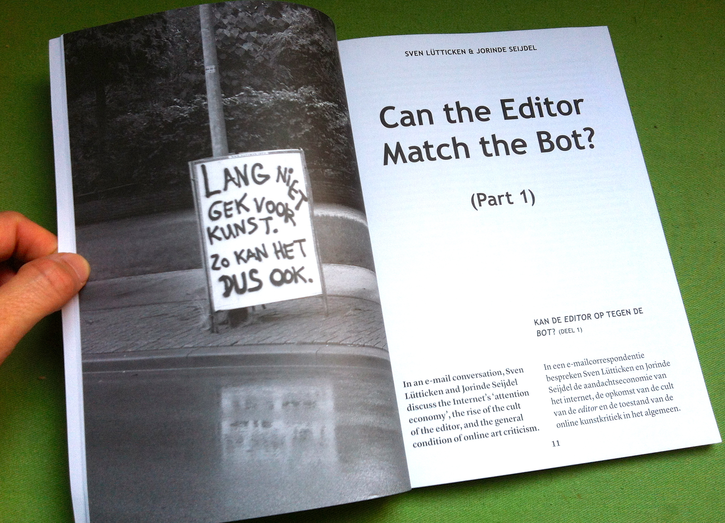 The new issue of Kunstlicht, the art-history journal affiliated with VU University Amsterdam, is titled “Art Criticism in the Networked Age.” One of the contributions is an e-mail conversation in two parts between Open! editor Jorinde Seijdel and myself, moderated by Steyn Bergs: “Can The Editor Match the Bot?”