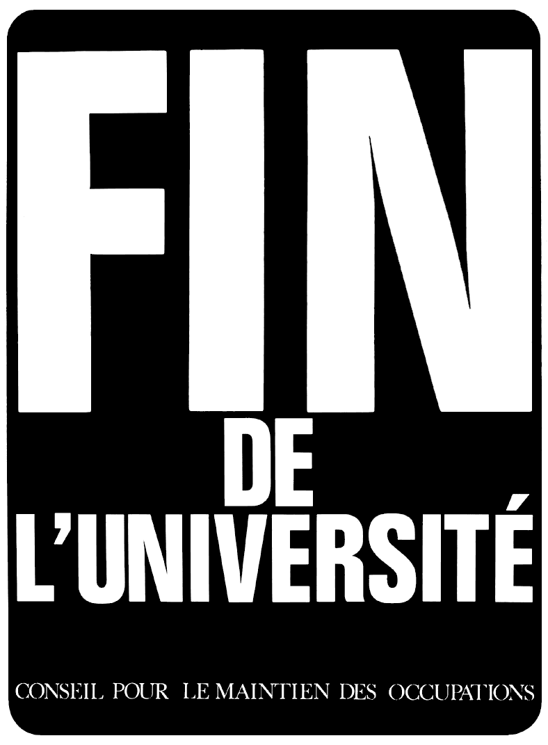 In 1968, the Situationist-dominated “Council for Maintaining the Occupations” at the Sorbonne put out a poster decreeing the “End of the University.” Now that universities have been occupied by rather different forces, a dystopian version of this utopian promise is a daily lived reality.