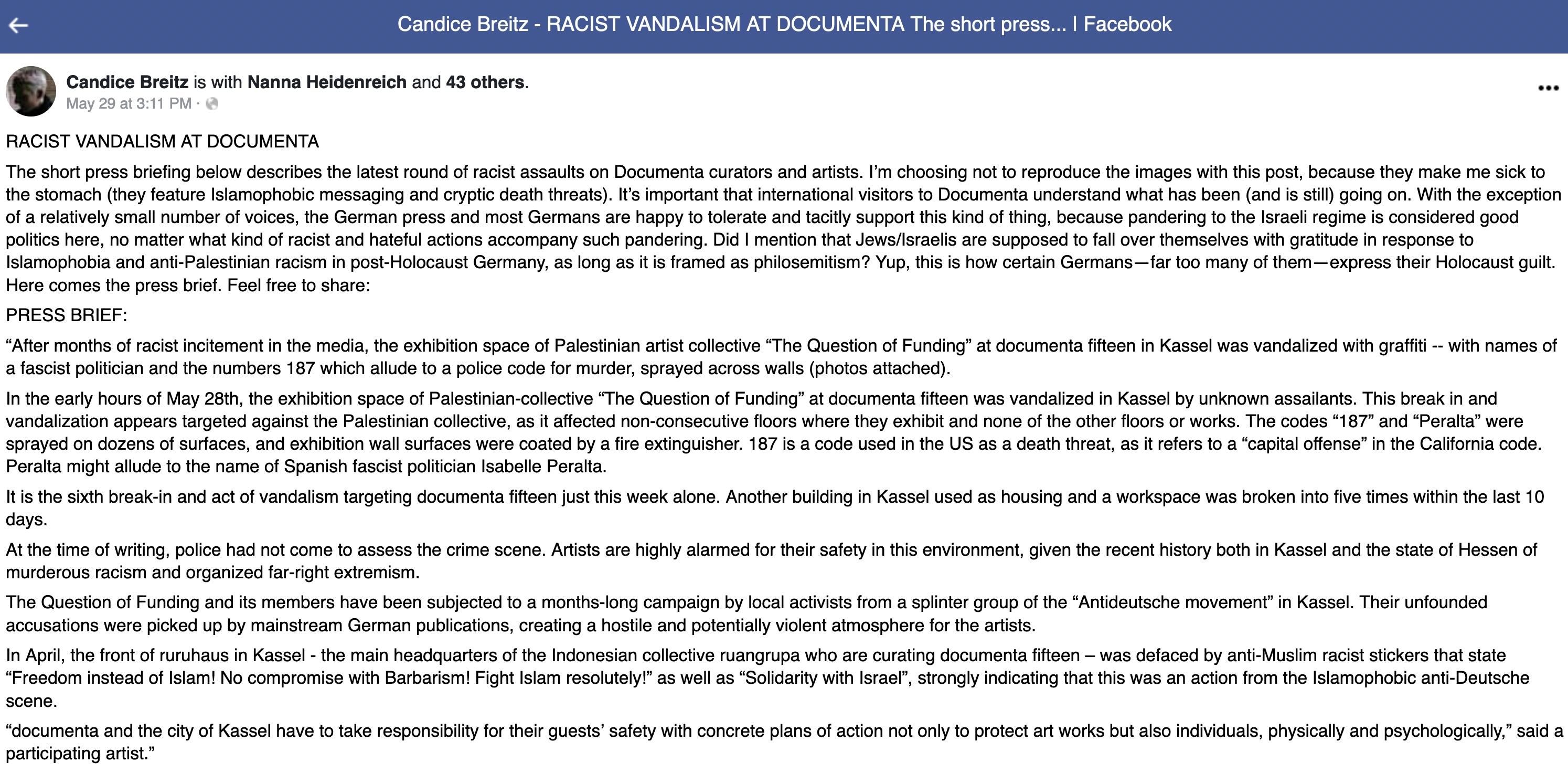 As a result, the forum We need to Talk! Art — Freedom — Solidarity, which was supposed to provide a platform for discussing these matters, has been cancelled by the Documenta organization, because a “free and productive discussion” seemed “impossible.” A strong contender for the 2022 German Irony Award! Oh, and there’s a whole history of acts of vandalism and intimidation occurring at Documenta-related sites in Kassel, including the ruruHaus and the premises of the Palestinian collective The Question of Funding. Candice Breitz shared a statement by Documenta insiders on a certain platform: