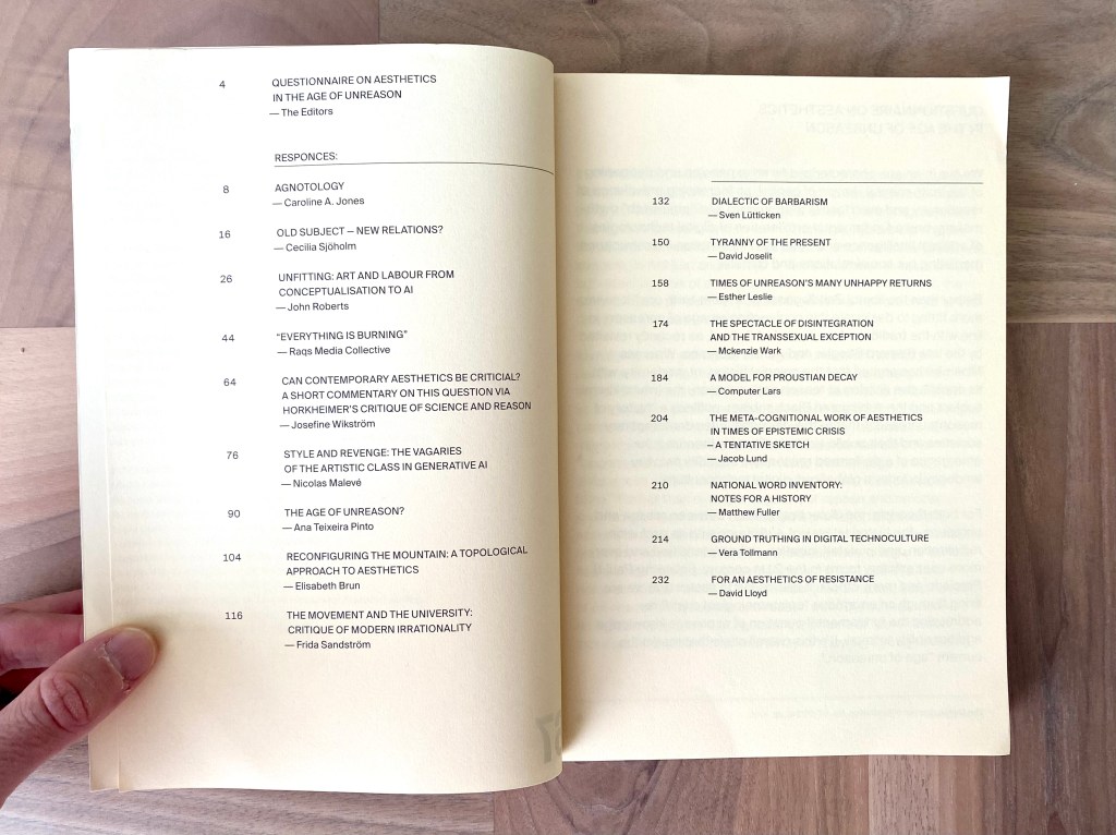 The latest issue of the Nordic Journal of Aesthetics(vol. 33, no. 67) was edited by Tobias Dias and Maja Bak Herrie, and is titled Aesthetics in the Age of Unreason. From the editorial:
